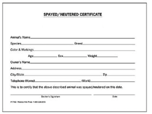 A rabies proof is required to prove that your pet has been vaccinated against rabies. A rabies proof identifying your pet as spayed/neutered or a spay/neuter proof may be accepted as documentation of sterilization.
